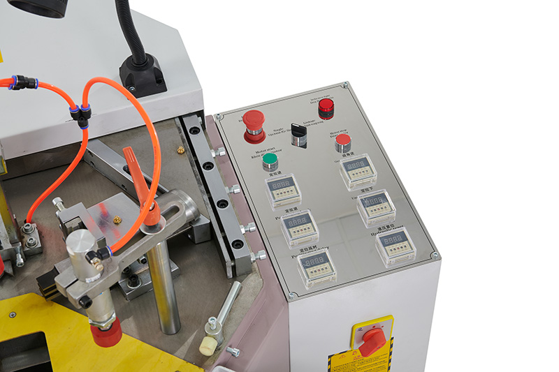 Hình ảnh: Các nút bấm kỹ thuật số - Máy ép góc được thiết kế các hệ thống dao bên trái và bên phải rất chính xác giúp tránh biến dạng trong quá trình ghép nhôm và đảm bảo liên kết giữa các góc cửa trở nên vững chắc, đồng đều và an toàn hơn.